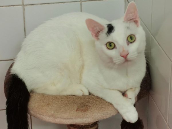 Hattie is a beautiful young lady (approx 2-3yrs) who loves nothing more than fuss and attention. She is very affectionate, especially when her tummy is empty, and will meow at the top of her voice until she is fed! Her love of food is clearly apparent as she is a very cuddly kitty for her age. Hattie is currently unsure of how to play, so will need lots of interactive stimulation to help her become more active. Hattie does prefer her own company but will tolerate other calm cats.