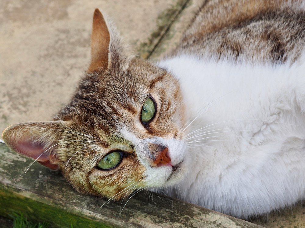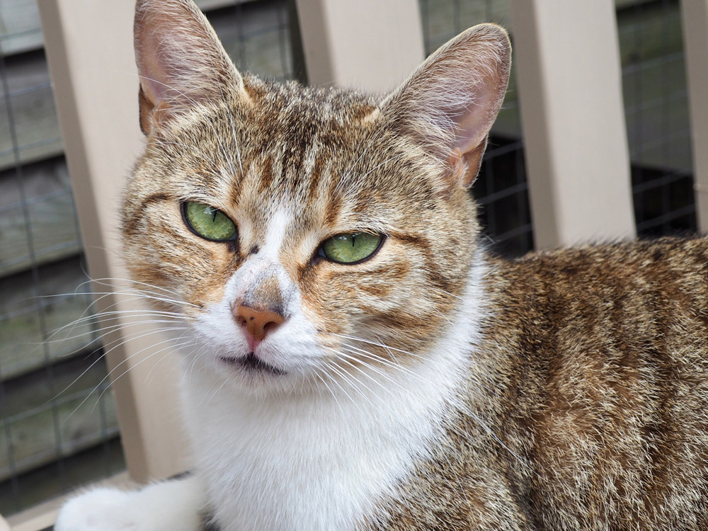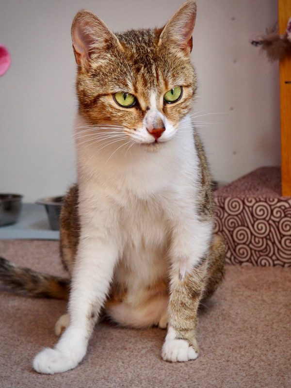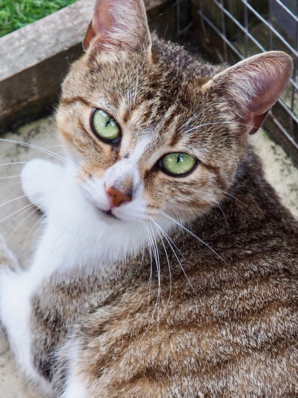 Beautiful green eyed Honey came into foster care with her four very young kittens after they were discovered living in an empty property on a building site. She has finished raising her kittens now & is looking for a home of her own. She is definitely used to being around people so we are certain she did have a home at some point. She is very friendly & affectionate & loves human company. The vet has estimated her to be around 18 months – 2 years old. She will be fine living with children of all ages but hasn’t been tested with other cats or dogs while in foster care so it will be nice for her to be an only cat & she will settle into her new home quickly & enjoy all the attention. She loves chilling in her outdoor run when the weather is nice so we would like her to have a garden she can explore when she has settled in, away from busy roads. If you would like to offer Honey a home please fill in the adoption enquiry form.