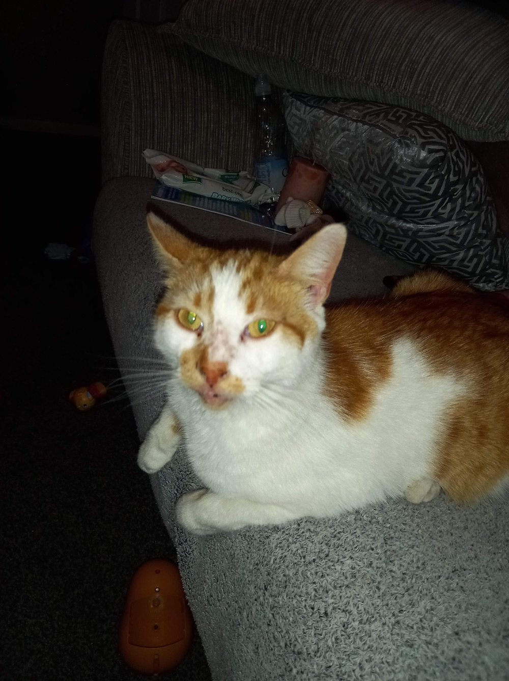 Marley is a friendly boy and will be two in August. He is being rehomed through no fault of his own, as owner unwell and unable to care for him He is Good with small children and other cats but not been around dogs so unsure how he would be. He is neutered and chipped very affectionate and in good Faithful..very attentive outside like as if he’s telling the others this is my owner not ours…not one for fuss unless its wen he wants it …really into his padding gets excited from it !!!! Luvs his scratchpost…he’s a typical teenager shows off in garden running round rolling round on grass…still hasn’t grasped the fact that u don’t crap on ur own garden !!! Blatant wiv it as well…outside he’s a show off and a little dominant but wen he’s inside if my front door is open he will let all neighbour’s cats in let them eat his food etc …frustrating as in my little square ther are 7 cats 🐈 luvs his treats more than his food he’s spoilt…likes his mid morning and just b4 tea.pieces of cooked meat…sleeps day time out at night but this nice weather im out so he likes to be out with me …in out in out..and follows her.