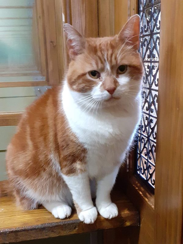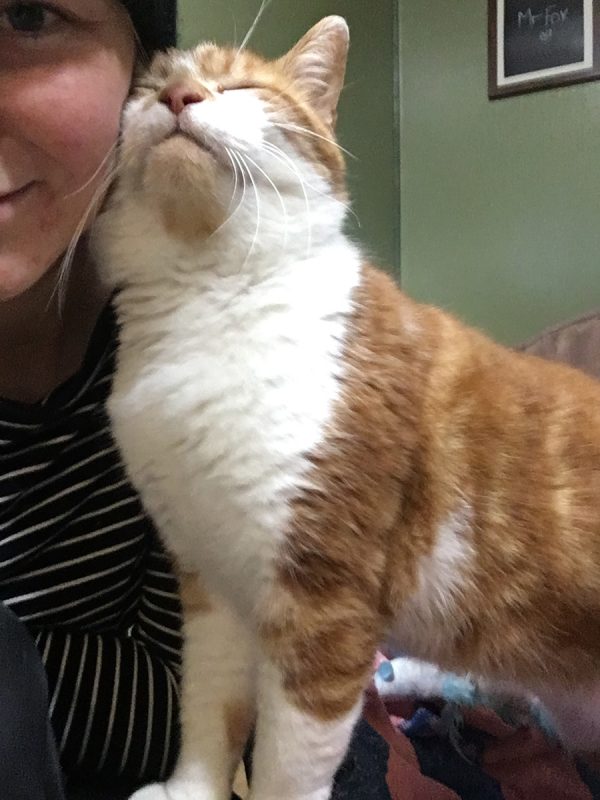 Mr Fox is the most sweet and loving boy you could meet. He forms amazing bonds with humans and loves to show his affection by rubbing noses, giving head butts and purring away. He loves to follow you around and enjoys being picked up and carried about, he’s a proper lap cat and enjoys getting all the attention he can. He’s a very chatty boy and likes to use his croaky meow to bribe you for food and fuss, this has resulted in him being a bit of a chunky monkey. He’s approximately 8-10 years old and was living the life of a stray before being rescued. He’s had some naughty tummy bugs in the past but has now had the all clear and is in full health. He does however need to remain on a strict diet to avoid an upset stomach again. To make sure he doesn’t try to sneak in any other food we think an indoor home with a catio or a cat proofed garden would be best suited to him. For anybody hoping to adopt him without a catio, we would be happy to donate £200 to help cover the costs of building one for our very special boy. We also think a home without other cats would be best to prevent him accidentally eating other cat food. As he’s such a loving boy we can imagine him bonding well with calm and gentle children who can give him the time and space needed to settle in to his new forever home. He would make a great companion and would love a home where he can get all the attention he deserves and desperately wants