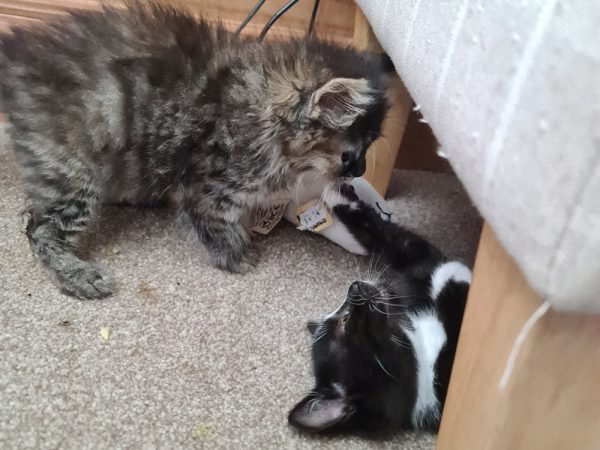 They are currently in a foster home with lots of other kittens and some adult cats and are very good with all of them. They have not met a dog but should be fine with calm, cat tested dogs. They are fine to go to homes with children.