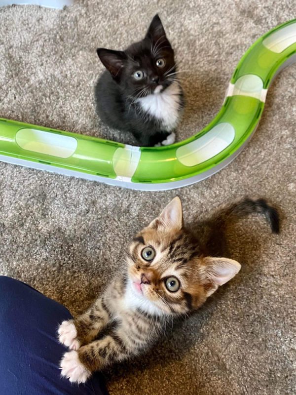 These two perfect little boys have been very close from the beginning. They are always playing together and grooming each other (or planning more ways to get up to mischief!). They’re very inquisitive young lads.. their favourite toy is the senses circuit – they could spend hours batting the ball around and pouncing at the lights!