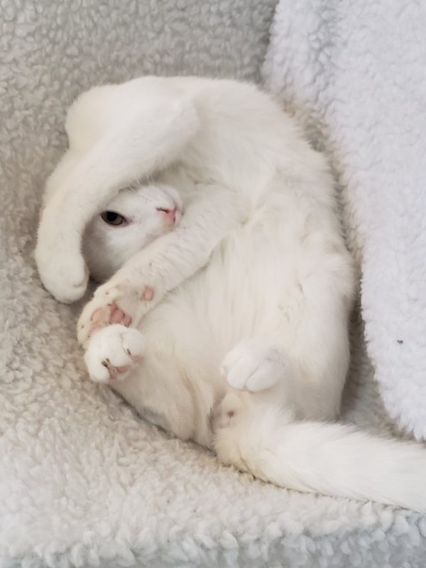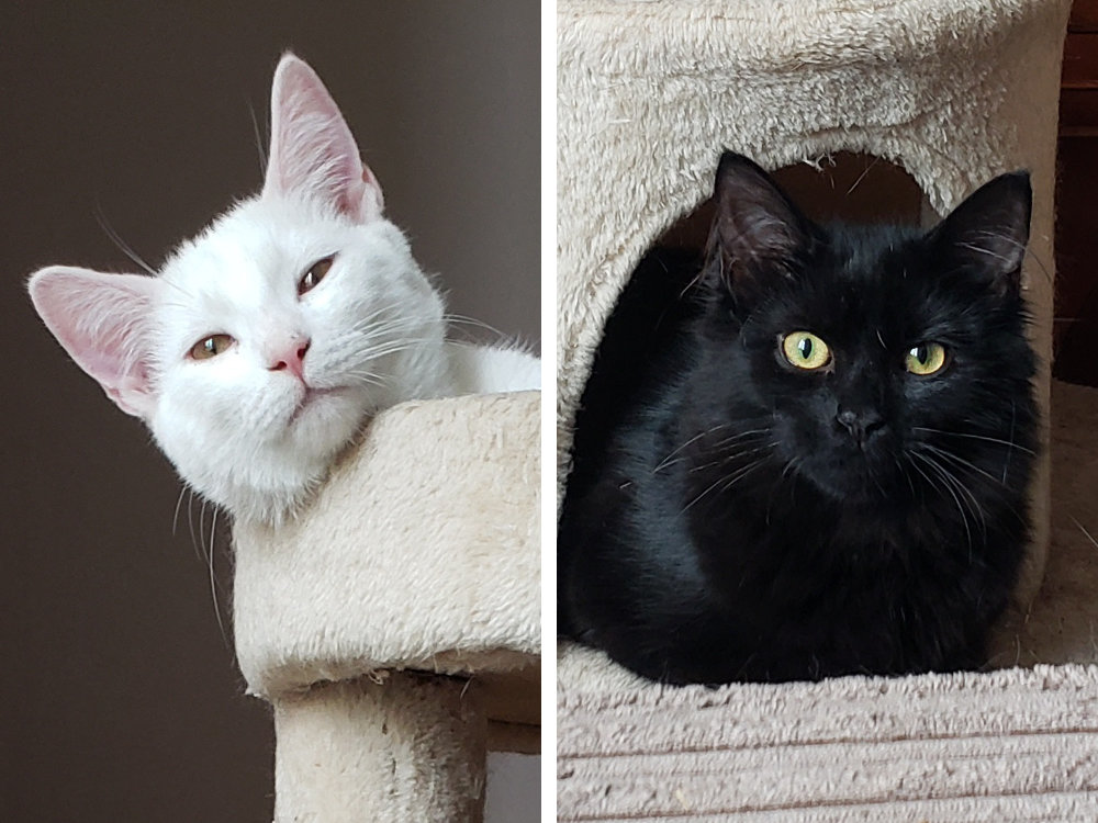 Cleo is a fluffy little black ball of fur, soft and sweet. Nero is pure white and full of energy. They balance each other very well like yin and yang.