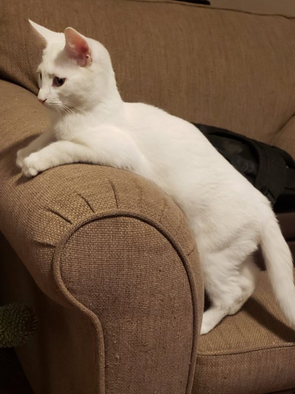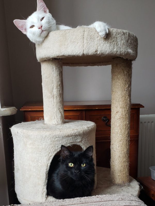 Both love pets and snuggles. They also love treats, especially chicken and ham. They will exaggerate and say they haven’t been fed for days, but don’t you believe them. They are greedy little kitties.