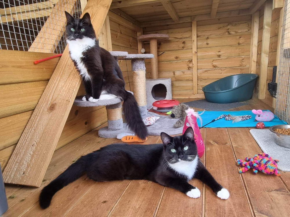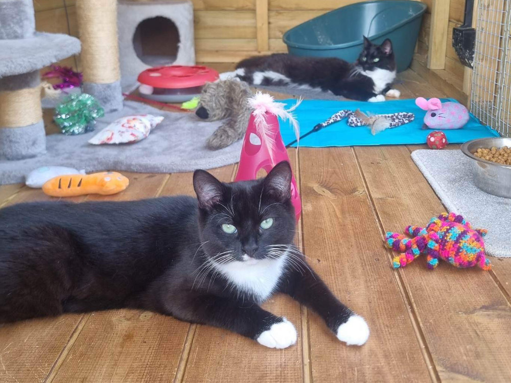 Humpty and Dumpty are the sweetest little sisters who came into rescue from the streets. Humpty gave birth to kittens at 5 months old, her kittens are now in foster care. Humpty also couldn’t weight bear on one of her legs when she arrived, she’s been through a lot bless her so is the more timid one of the two. She has recovered physically now. She will need someone willing to put the time and effort in to earn her trust… but once you do it will be so worth it, she is very loving and affectionate. Dumpty on the other hand is super confident, has the loudest purr, she loves to play and helps her sister so much with her confidence. Humpty and Dumpty would be fine with a spacious indoor home or a safe garden well away from busy roads (they will NEED to be kept indoors for the first 6 MONTHS minimum) catio/ pet proof garden even better! Please apply if you think you could offer these adorable sister their forever home.