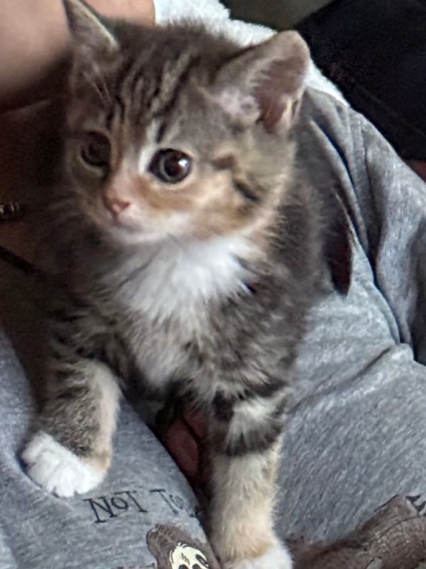 She was so good at the vets and was petted by everyone very much to her enjoyment. Her coat is tabby but striped with red a very unique coat so soft. Honey loves toys and is very bright. Ideally she would love to homed with big brother but loves to lay on the bed next to you for comfort.