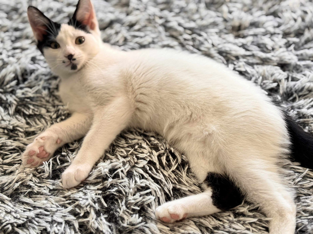 Hi my name is Kit aka 1st born as I was the first kitten in my litter to be born, I was born on the 24th May 2025. I am white and black and super cute, so my foster mummies tell me. I like a fuss but I’m not overly fond of being picked up at the moment I am getting to like it more the more I get picked up. I am a confident boy and I love to run around with my brothers and sisters and play with lots of different toys!