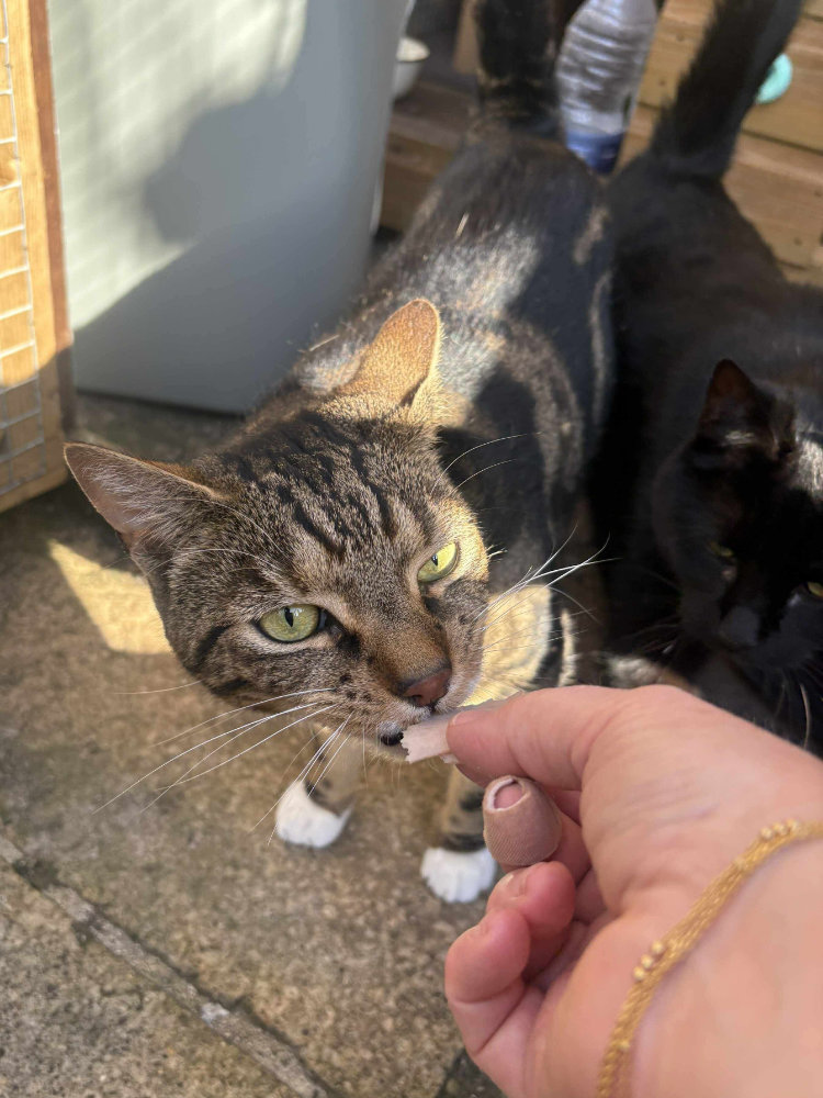 TJ is a big boy with a massive personality. A bit like the lion from the Wizard of Oz, he’s full of bravado but is very nervous underneath the sometimes feisty exterior. He loves to play with laser pens and feathery toys, when he is not trying to steal his brothers food!